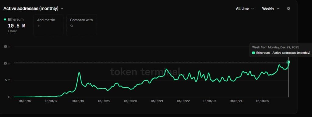Selain itu, jumlah alamat aktif bulanan di Ethereum (ETH) juga mencapai puncak baru dengan total 10,4 juta alamat pada bulan Desember. Peningkatan ini menunjukkan bahwa semakin banyak pengguna yang memanfaatkan Ethereum (ETH) untuk berbagai kebutuhan transaksi digital mereka.