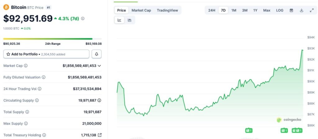 Jakarta, Pintu News ā Bitcoin mengalami kenaikan signifikan menuju $93.000 pada hari Senin, seiring dengan komentar Presiden AS Donald Trump yang menyarankan tindakan lebih keras terhadap Kolombia dan Meksiko. Komentar ini muncul setelah operasi militer AS di Venezuela, yang menambah ketidakpastian geopolitik di kawasan tersebut.