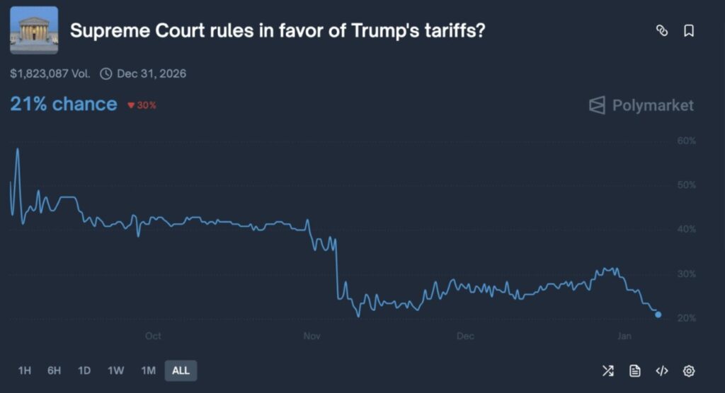 Kekhawatiran ini tampaknya didukung oleh pasar prediksi. Data dari Polymarket menunjukkan adanya kemungkinan sekitar 79% bahwa pengadilan akan membatalkan tarif tersebut.