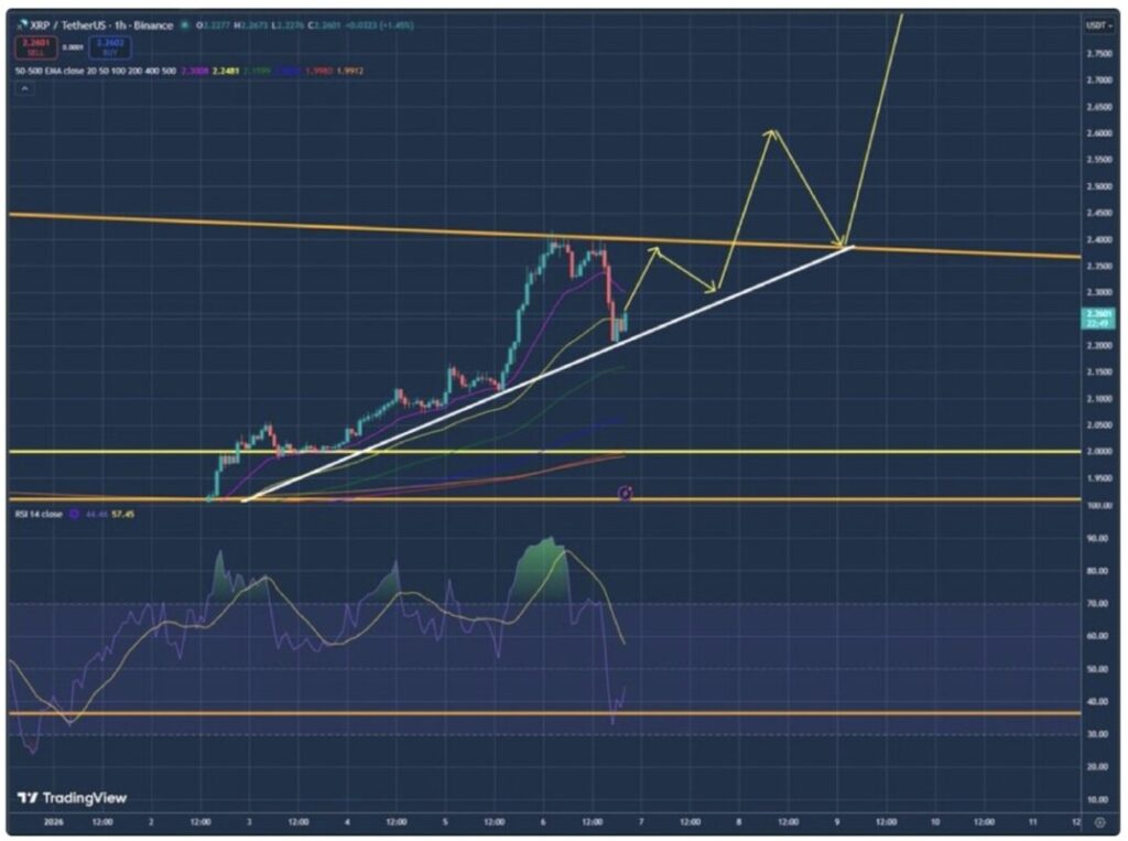 Dari sisi teknikal, XRP masih bertahan di atas garis tren support yang terus naik, meskipun sempat terkoreksi dari level tertinggi baru-baru ini di sekitar $2,41. Harga sempat turun di bawah $2,32 dan menyentuh level $2,25, namun pembeli segera masuk untuk menahan penurunan lebih lanjut.