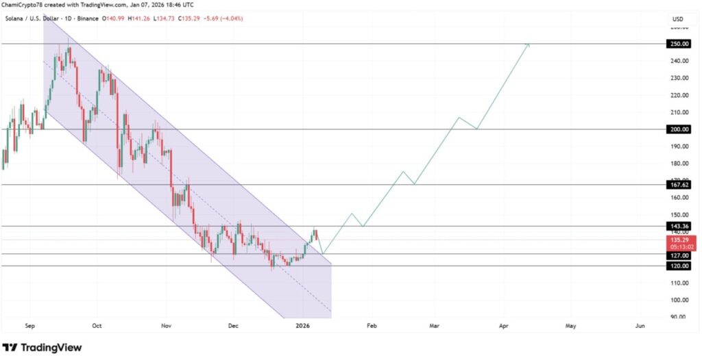 Harga Solana telah berhasil menembus saluran tren turun yang membatasi pergerakan sejak akhir 2025. Ini menandakan bahwa dominasi penjual atas tren besar telah berakhir. Namun, reli harga terhenti setelah mengalami penolakan di kisaran $143, sehingga fokus kini bergeser dari ekspansi ke pengujian validitas struktur.