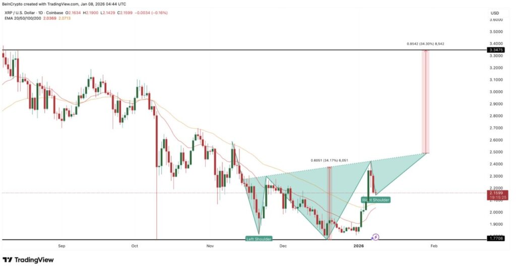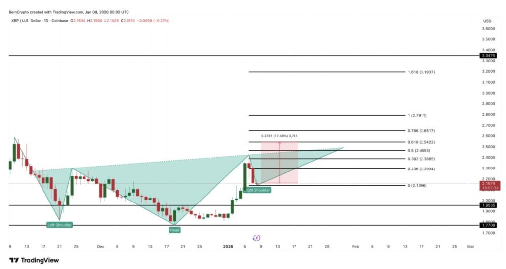 Penurunan harga XRP baru-baru ini tampaknya sedang membentuk bagian bahu kanan dari pola inverse head-and-shoulders. Pola ini muncul ketika tekanan jual mulai melemah setelah penurunan yang dalam, dan pembeli secara perlahan mulai mengambil alih kendali.