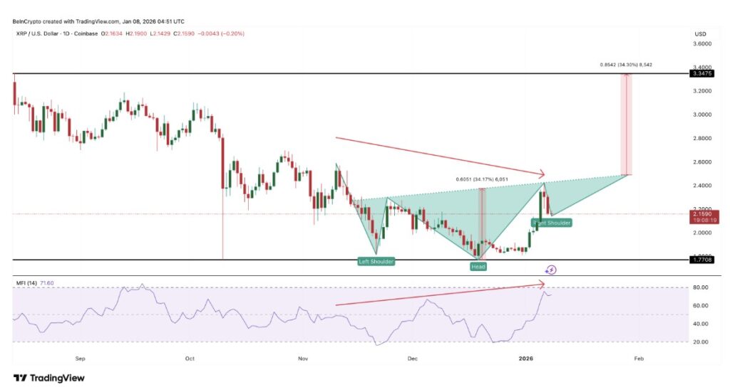 Pola klasik inverse head-and-shoulders mulai terbentuk, dan jika pola ini berhasil terselesaikan seiring meningkatnya tekanan beli, potensi kenaikan harga diperkirakan bisa mencapai sekitar 34%.