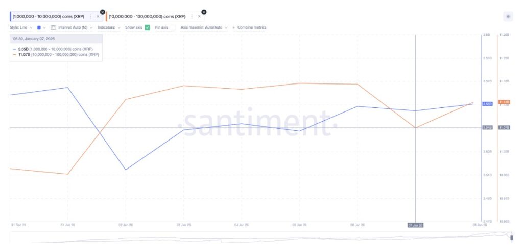 Data on-chain menunjukkan bahwa dua kelompok pemegang besar (whales) secara aktif membeli XRP. Dompet yang menyimpan antara 1 juta hingga 10 juta XRP telah meningkatkan saldo mereka dari sekitar 3,54 miliar token menjadi 3,55 miliar token setelah 5 Januari.