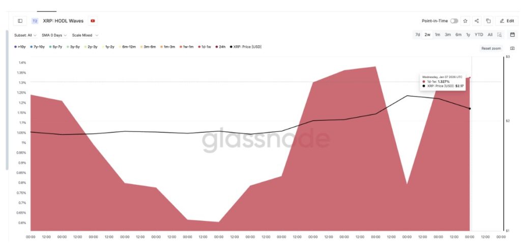 Data HODL Waves—yang mengelompokkan pemegang berdasarkan lamanya waktu kepemilikan—menunjukkan bahwa pemegang jangka sangat pendek (yang hanya memegang XRP selama satu hari hingga satu minggu) telah meningkatkan proporsi kepemilikan mereka secara signifikan sejak 30 Desember.