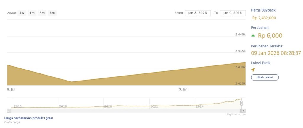 Berdasarkan data pada grafik di atas, harga buyback emas per 1 gram pada tanggal 9 Januari 2026 mengalami kenaikan sebesar Rp6.000 dibandingkan hari sebelumnya. Harga buyback terbaru tercatat sebesar Rp2.432.000, setelah sebelumnya berada di kisaran Rp2.426.000 pada tanggal 8 Januari 2026.