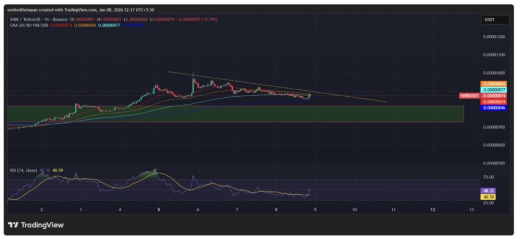 Shiba Inu saat ini menghadapi tekanan jual setelah kehilangan level support di $0.00000888. Namun, penurunan ini berpotensi menemukan support baru di sekitar rata-rata pergerakan (moving average), yakni di kisaran $0.0000085. Per 8 Januari, harga SHIB diperdagangkan di level $0.00000872, turun lebih dari 2% dalam 24 jam.