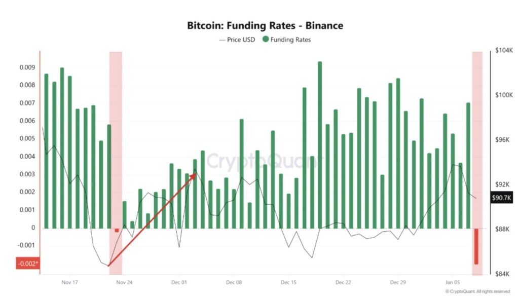 Sinyal pertama berasal dari tingkat pendanaan (funding rate) Bitcoin di Binance. Dalam analisis terbarunya, Burak Kesmeci menyoroti bahwa funding rate telah berbalik negatif pada grafik harian untuk pertama kalinya sejak 23 November 2025.