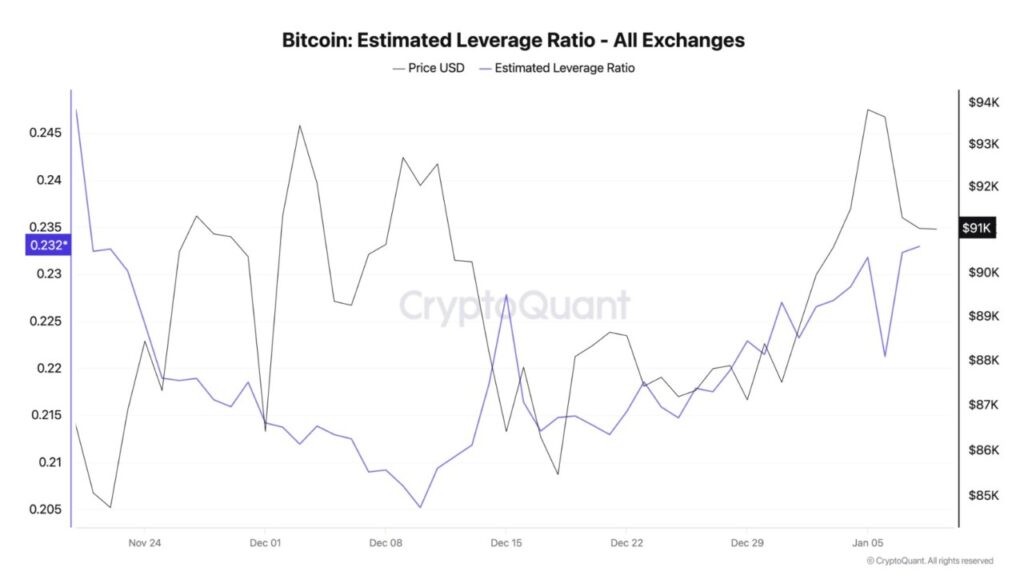 Terakhir, rasio leverage estimasi (Estimated Leverage Ratio) Bitcoin telah mencapai titik tertinggi dalam sebulan terakhir, menurut data dari CryptoQuant.