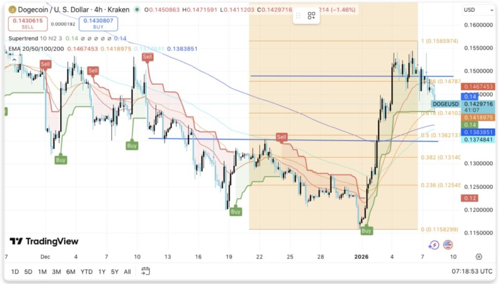 Yang penting untuk dicatat, DOGE masih diperdagangkan di atas area kunci gabungan antara level Fibonacci dan klaster EMA, yang memperkuat bias bullish. Zona $0,141 hingga $0,142 menjadi titik penting pertama yang harus dipertahankan oleh para bull.