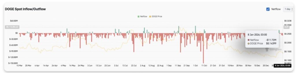 Data aliran spot mendukung pandangan ini. Dalam beberapa sesi terakhir, aliran keluar bersih (net outflows) dari bursa terus mendominasi, yang berarti DOGE ditarik keluar dari platform perdagangan.