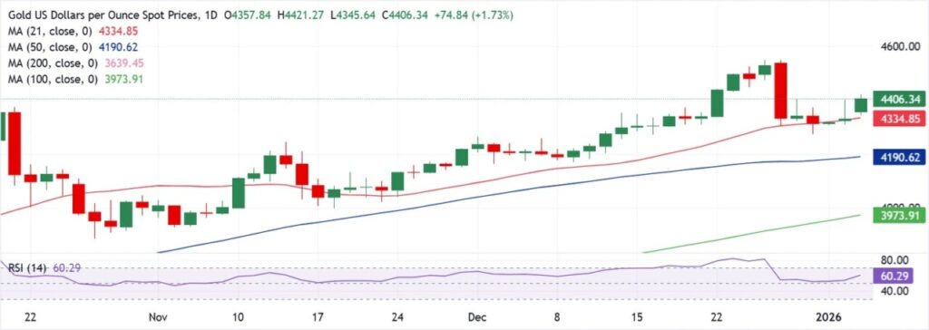 Analisa XAU/USD hari ini mencatat dampak kuat dari ketegangan geopolitik, terutama terkait aksi militer Amerika Serikat di Venezuela dan kekhawatiran yang meluas terhadap stabilitas global. Ketidakpastian politik dan potensi konflik lanjutan mendorong investor beralih ke emas sebagai aset safe-haven, sehingga naiknya permintaan membantu harga emas memantul di atas level $4.400 per ounce. Permintaan safe-haven ini juga terlihat dalam penguatan pasar pada awal pekan, memperkuat bias bullish harga emas.