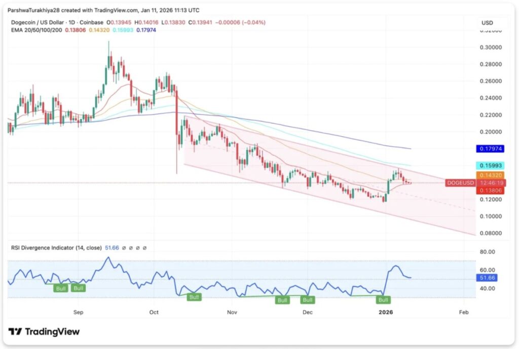 Saat ini, DOGE diperdagangkan sedikit di atas EMA 20-hari ($0,1380), namun masih berada di bawah seluruh rata-rata pergerakan untuk jangka waktu yang lebih panjang. Channel menurun yang telah membatasi harga sejak Oktober masih berada di atas harga saat ini, dengan level resistensi di sekitar $0,145.