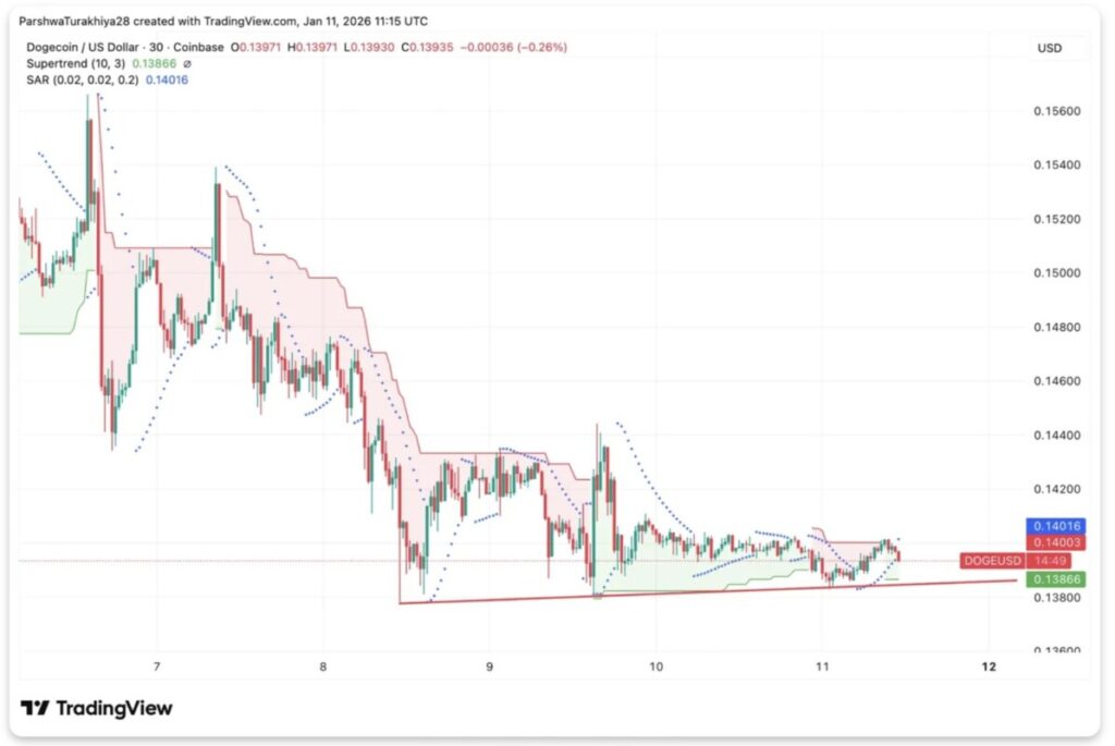 Pada grafik 30-menit, Dogecoin terlihat bertahan di atas level dukungan Supertrend di $0,1386, yang sejauh ini menjadi lantai harga selama fase konsolidasi terbaru. Saat ini, harga sedang menguji sisi bawah dari resistensi channel menurun di sekitar $0,1400.