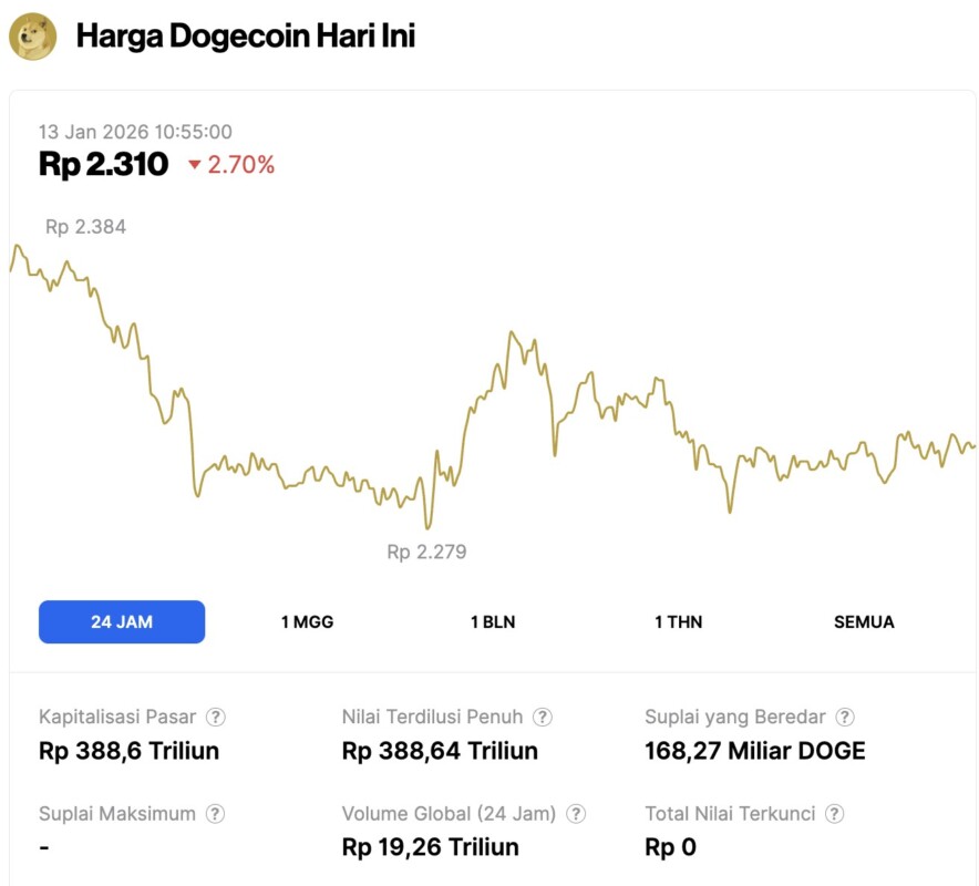 Pada 13 Januari 2026, harga Dogecoin tercatat mengalami penurunan 2,70% dalam waktu 24 jam, diperdagangkan pada harga $0.1368 atau setara dengan Rp2.310. Dalam periode 24 jam terakhir, harga DOGE bergerak dalam kisaran Rp2.384 hingga ke Rp2.279.