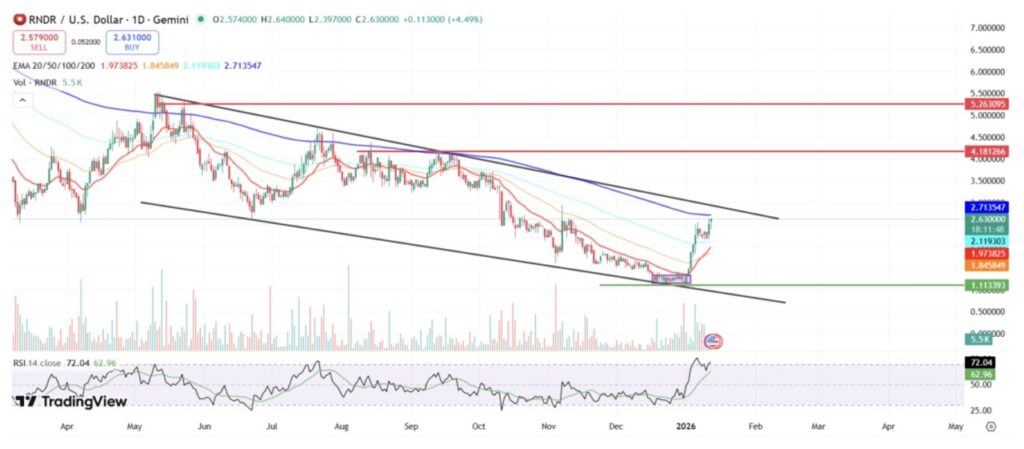 Lebih lanjut, harga Render telah naik lebih dari 60% di awal tahun 2026, menandakan meningkatnya minat beli dan sentimen pasar yang mulai membaik.