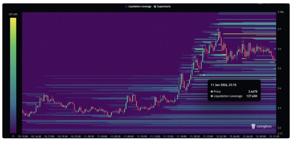 Tercatat likuidasi senilai $100.000 terjadi di sekitar level $2,40, sementara liquidity pool berikutnya berada di sekitar $3 — yang bisa menjadi pemicu kenaikan harga lebih lanjut.