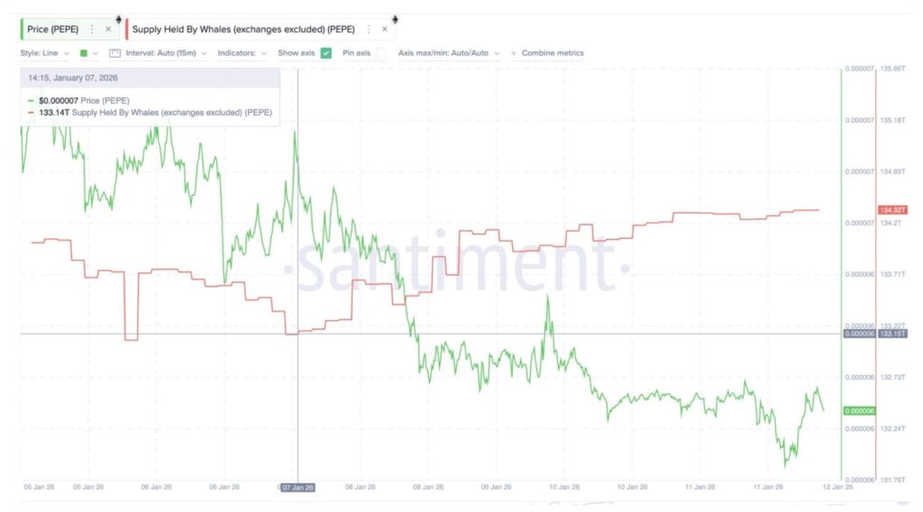 Yang menarik perhatian adalah perilaku whale selama penurunan ini. Sejak 7 Januari, dompet whale meningkatkan kepemilikan mereka dari 133,15 triliun PEPE menjadi 134,32 triliun, penambahan sekitar 1,17 triliun token.