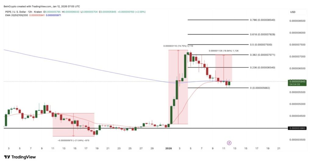 Secara historis, pemulihan kembali ke atas EMA 20-periode menjadi sinyal penting bagi Pepe. Reclaim terakhir yang terjadi pada 1 Januari memicu reli sebesar 74%. Jika terjadi penutupan yang bersih di atas kedua EMA pada time frame 12 jam, maka PEPE berpotensi naik ke $0,0000075, lalu $0,0000085.