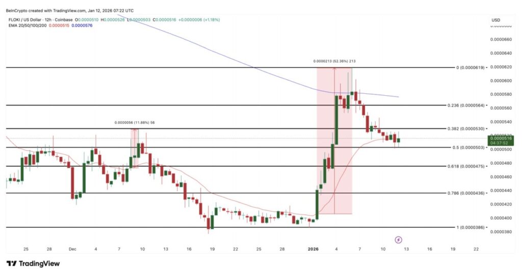 Grafik harga memberi petunjuk teknikal yang mendukung. Pada grafik 12 jam, FLOKI berhasil merebut kembali EMA 20-periode. Bagi Floki, level ini sangat penting. Setiap kali EMA ini direbut kembali dalam sebulan terakhir, harga mengalami lonjakan cepat. Pada 1 Januari, reclaim serupa memicu reli 52%, sementara reclaim yang lebih kecil pada 8 Desember menghasilkan pantulan 11%.