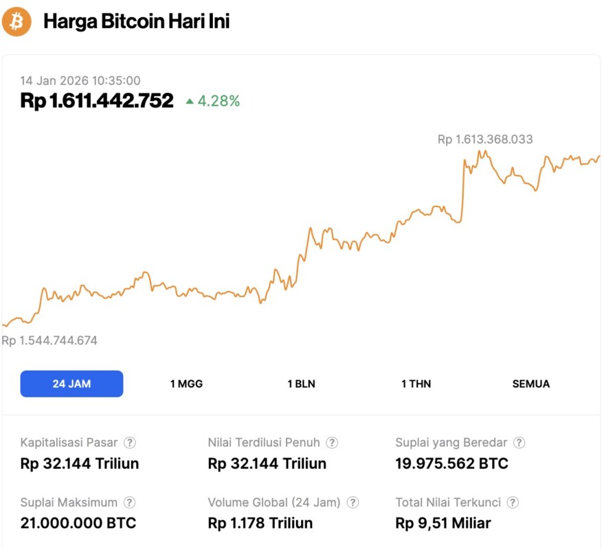 Pada 14 Januari 2026,Ā harga BitcoinĀ tercatat berada di level $95,469 atau setara dengan Rp1.611.442.752 mengalami kenaikan 4,28% dalam 24 jam terakhir. Sepanjang periode ini, BTC menyentuh level terendahnya di Rp1.544.744.674 dan harga tertingginya di Rp1.613.368.033.