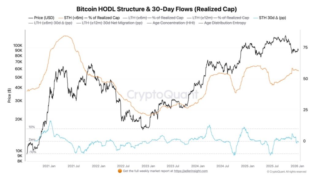 Menurut Adler Crypto Insight, struktur kepemilikan Bitcoin (BTC) telah stabil, meskipun menunjukkan bias bearish. Dari tanggal 5 hingga 11 Januari, pemegang jangka panjang (lebih dari 6 bulan) mengalami peningkatan dalam bagian cap yang direalisasi dari 43,29% menjadi 43,69%. Perubahan ini menunjukkan pergeseran kepemilikan ke arah pemegang jangka panjang.