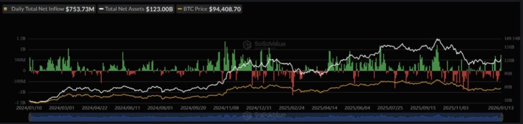 Permintaan dari institusi keuangan juga menjadi faktor penting dalam lonjakan pasar kripto. Arus masuk dana ke ETF Bitcoin spot di AS pada 13 Januari tercatat sangat besar, dengan total mencapai $754 juta.