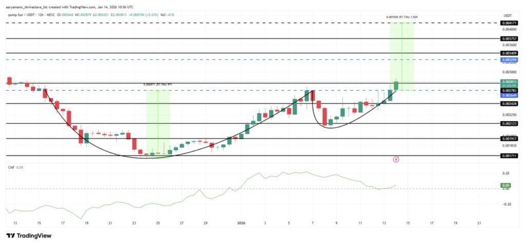 Per 14 Januari, PUMP diperdagangkan di sekitar $0,00281, mencerminkan sentimen jangka pendek yang membaik. Struktur teknikal juga mendukung prospek yang bullish. PUMP sedang mengalami breakout dari pola cup-and-handle pada grafik 12 jam, yang biasanya menandakan kelanjutan tren naik. Pola ini memproyeksikan potensi kenaikan sebesar 57,7% menuju $0,00417.