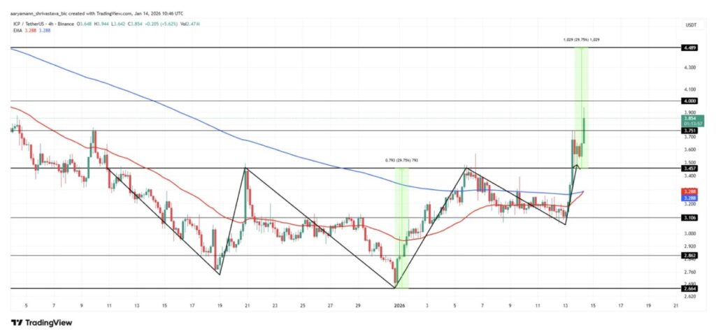 Internet Computer sempat diperdagangkan di sekitar $3,85 pada 14 Januari dan membentuk pola inverse head-and-shoulders yang jelas terlihat. Pola teknikal bullish ini sering kali menandakan pembalikan tren setelah periode pelemahan yang berkepanjangan.