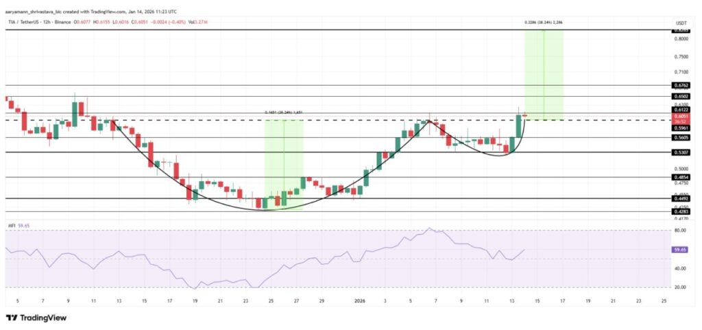 Per 14 Januari, TIA sempat diperdagangkan di sekitar $0,60 dan mendekati zona breakout. Pola ini memproyeksikan potensi kenaikan sebesar 38,2%, dengan target teknikal di kisaran $0,82 jika kondisi pasar secara umum tetap mendukung.