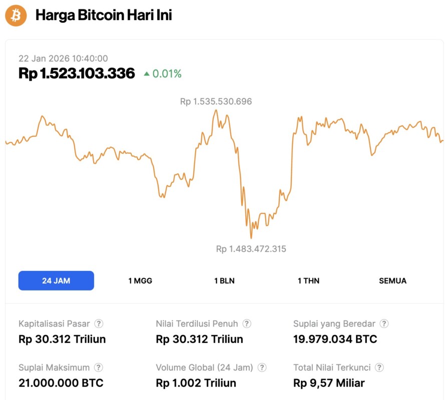 Pada 22 Januari 2026, harga Bitcoin tercatat berada di level $89,748 atau setara dengan Rp1.523.103.336, mengalami kenaikan tipis 0,1% dalam 24 jam terakhir. Sepanjang periode ini, BTC menyentuh level terendahnya di Rp1.483.472.315 dan harga tertingginya di Rp1.535.530.696.