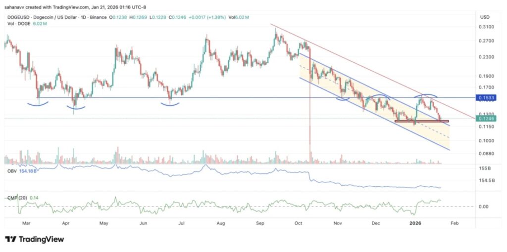 Harga DOGE saat ini membentuk pola channel menurun dengan titik tertinggi dan terendah yang semakin rendah, di mana setiap kali harga memantul ke sisi atas channel, selalu menghadapi tekanan jual. Token ini juga mengalami penolakan berulang di kisaran $0,15 hingga $0,153, menandakan bahwa level tersebut telah berubah dari support menjadi resistance.