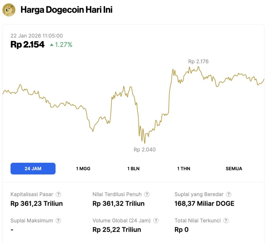 Pada 22 Januari 2026, harga Dogecoin tercatat mengalami kenaikan 1,27% dalam waktu 24 jam, diperdagangkan pada harga $0.1269 atau setara dengan Rp2.154. Dalam periode 24 jam terakhir, harga DOGE bergerak dalam kisaran Rp2.040 hingga ke Rp2.176.