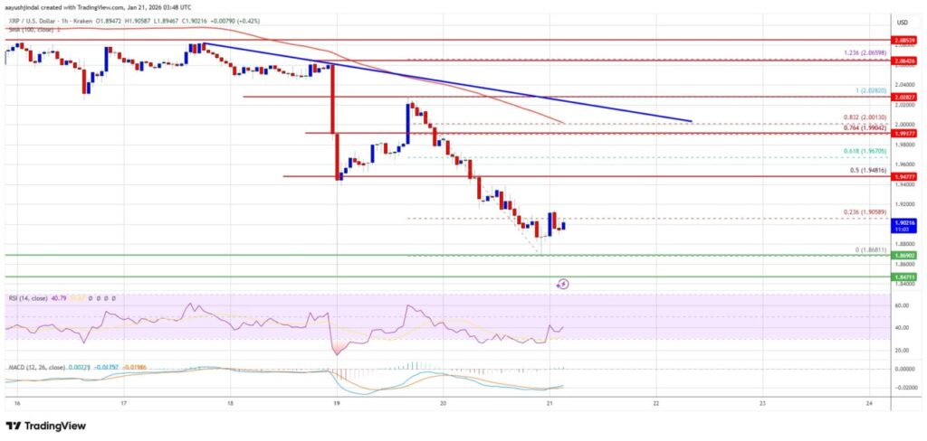 Setelah mencapai titik terendah, Ripple (XRP) mencoba pulih dengan menembus di atas $1,90. Namun, upaya pemulihan menghadapi rintangan di level retracement Fibonacci 23,6% dari penurunan terakhir dari $2,028 ke $1,8681. Saat ini, Ripple (XRP) diperdagangkan di bawah $1,920 dan rata-rata pergerakan sederhana 100 jam, menunjukkan bahwa tekanan bearish masih kuat.