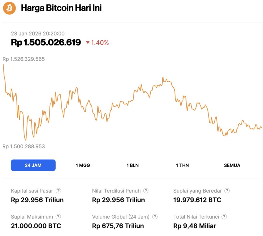Pada 23 Januari 2026, harga Bitcoin tercatat berada di level $89,240.57 atau setara dengan Rp1.505.026.619, mengalami penurunan 1,40% dalam 24 jam terakhir. Sepanjang periode ini, BTC menyentuh level terendahnya di Rp1.500.288.953 dan harga tertingginya di Rp1.526.329.565.