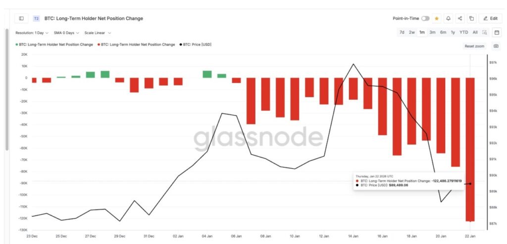 Pada 21 Januari, pemegang jangka panjang tercatat menjual sekitar 75.950 BTC (arus keluar). Namun pada 22 Januari, angka tersebut melonjak menjadi sekitar 122.486 BTC. Ini merupakan peningkatan sekitar 61% hanya dalam satu hari, menunjukkan percepatan tajam alih-alih distribusi yang bertahap.
