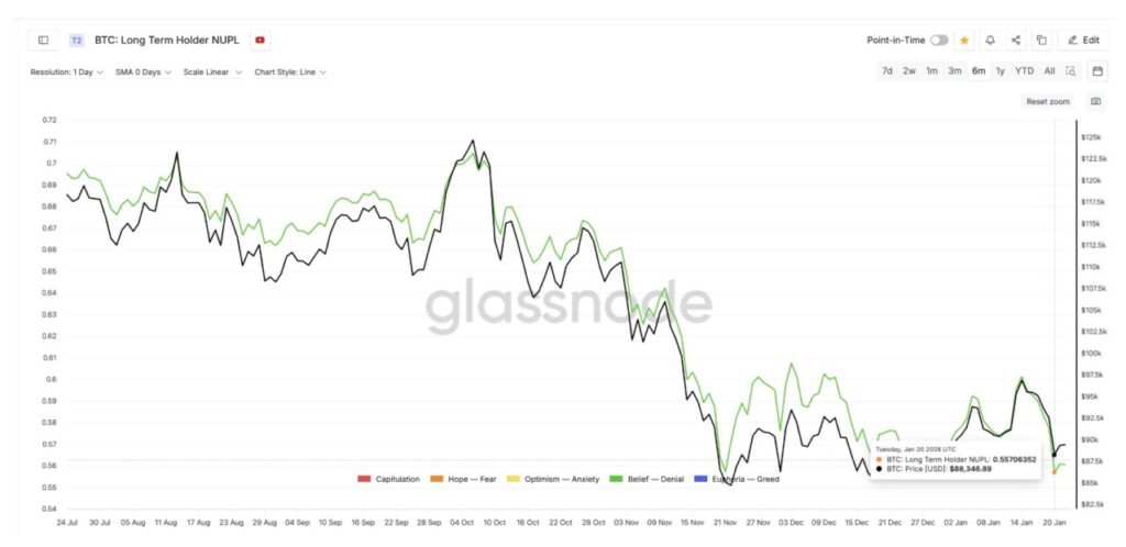 Penjualan ini bukan disebabkan oleh rasa takut, melainkan oleh berkurangnya keyakinan terhadap potensi kenaikan harga. Indikator NUPL pemegang jangka panjang, yang mengukur keuntungan atau kerugian yang belum direalisasi, turun ke level terendah dalam enam bulan terakhir, meski masih berada dalam zona keyakinan. Artinya, para pemegang tersebut masih dalam posisi untung.