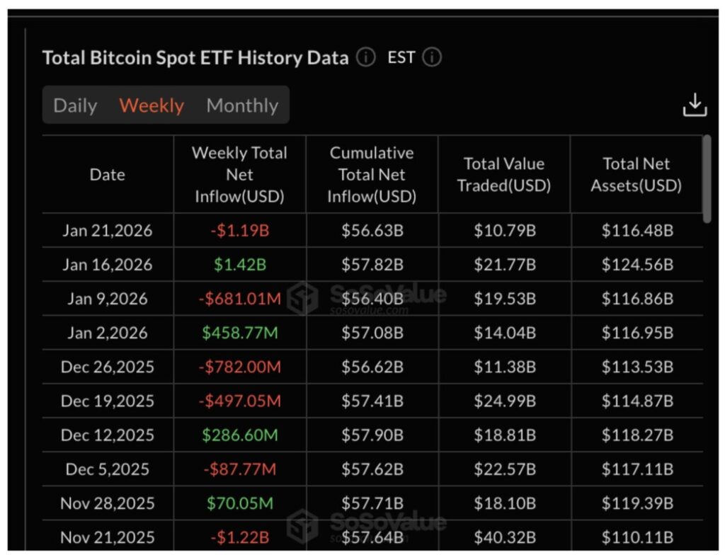 Untuk pekan yang berakhir pada 21 Januari, ETF mengalami penjualan bersih sekitar $1,19 miliar. Ini menghilangkan salah satu sumber permintaan stabil yang sebelumnya mampu menyerap tekanan jual dari para pemegang saat harga terkoreksi.
