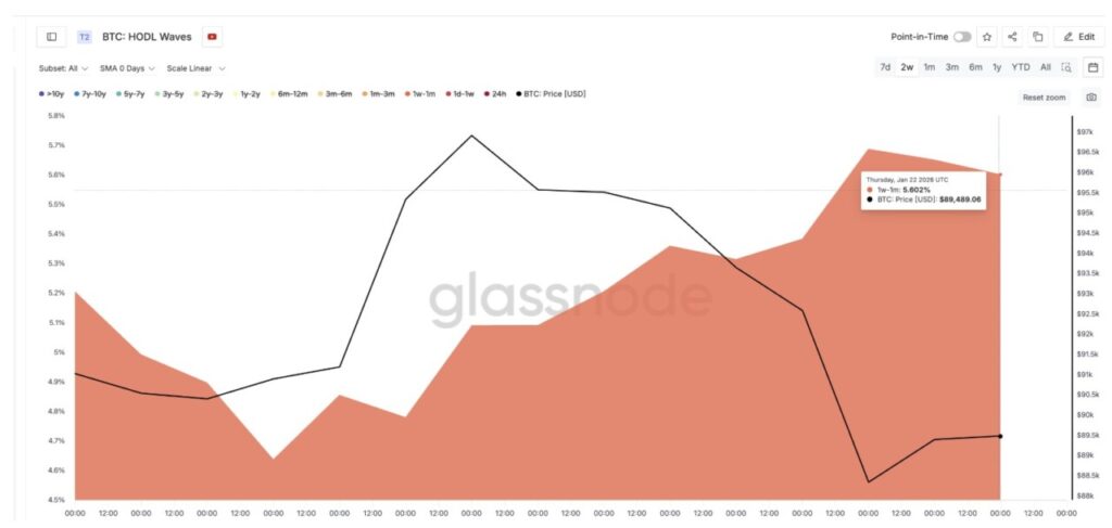 Di saat yang sama, data HODL Waves—metrik berdasarkan durasi kepemilikan—menunjukkan meningkatnya partisipasi spekulatif. Kelompok pemegang dengan durasi satu minggu hingga satu bulan meningkatkan porsi pasokan mereka dari sekitar 4,6% pada 11 Januari menjadi sekitar 5,6% saat ini. Ini berarti peningkatan hampir 22% dalam porsi kelompok tersebut dalam waktu singkat.