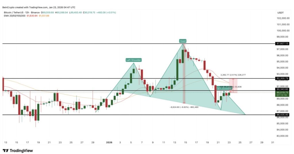 Di sisi atas, Bitcoin perlu menutup candle 12 jam secara kuat di atas $90.340 untuk meredakan tekanan jangka pendek (yakni di atas bahu kanan pola head-and-shoulders). Lebih jauh lagi, jika harga berhasil merebut kembali level $92.300, itu akan lebih signifikan karena mengembalikan posisi harga di atas rata-rata pergerakan penting.