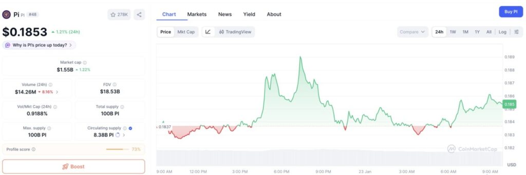 Pada hari ini, 23 Januari 2026, harga Pi Coin (PI) menunjukkan kenaikan sebesar 1,21% dalam 24 jam terakhir dan diperdagangkan di level $0,1853 per koin. Kapitalisasi pasar Pi Coin juga mengalami pertumbuhan, naik 1,22% menjadi sekitar $1,55 miliar.