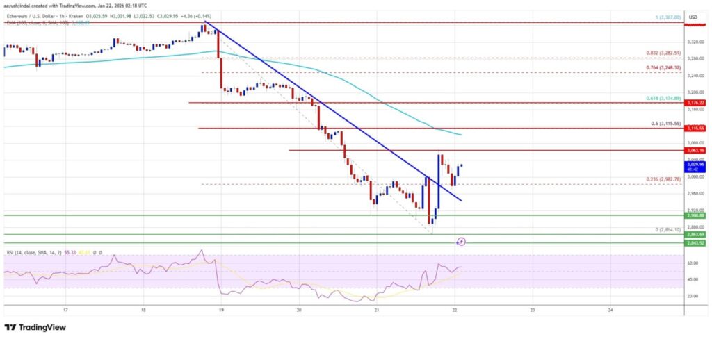 Jakarta, Pintu News –Ethereum baru-baru ini mengalami penurunan dari resistensi $3.000 dan saat ini sedang berusaha untuk pulih. Jika berhasil menembus $3.120, potensi pemulihan harga bisa terjadi.