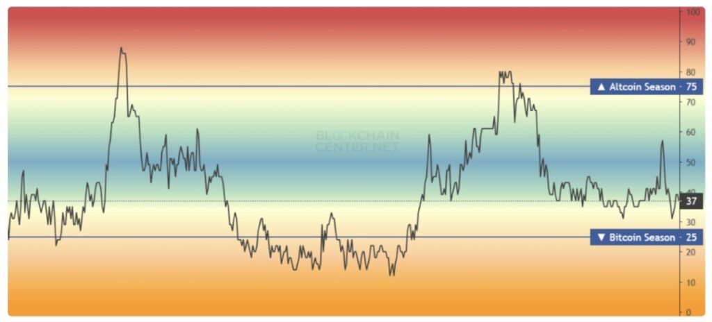 Namun, ketika musim altcoin memuncak di akhir 2017, dominasi ini anjlok hingga 32%, mencerminkan penurunan lebih dari 50 poin persentase dalam pangsa pasar Bitcoin.