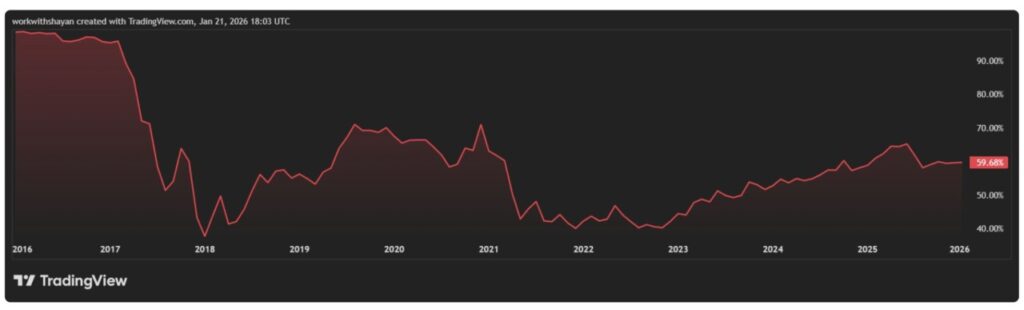Sebaliknya, tahun 2026 dibuka dengan dominasi Bitcoin berada di kisaran 59%–61%, level yang terus meningkat sejak 2023 setelah sebelumnya sempat menyentuh titik terendah sekitar 40%.