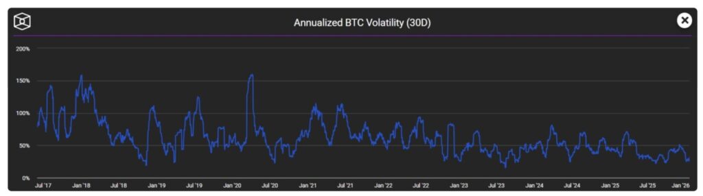 Namun, pada tahun 2025, meskipun Bitcoin mencapai rekor tertinggi mendekati $126.000 sebelum mengalami koreksi, volatilitas hariannya turun menjadi hanya 2,24%—terendah dalam sejarah Bitcoin.