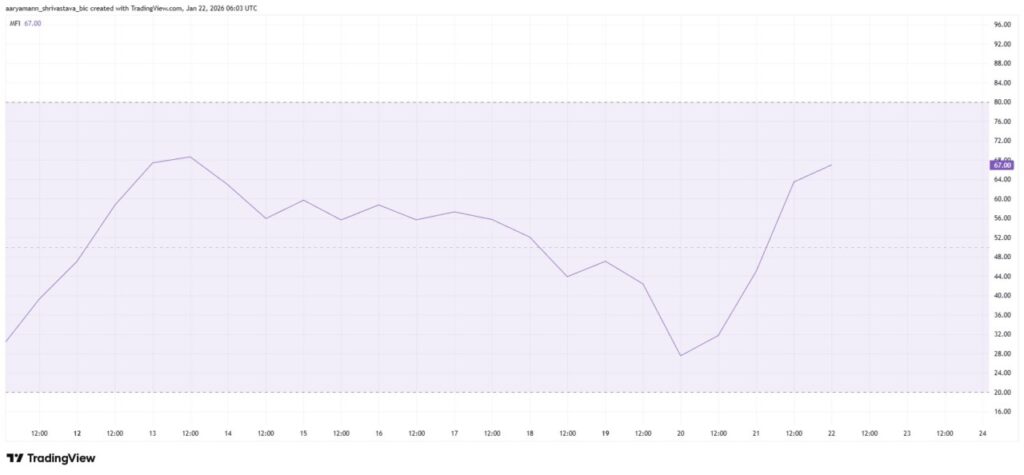 Dari sudut pandang momentum, kondisi pasar telah membaik lebih cepat dari yang banyak diperkirakan. Indeks Aliran Uang (Money Flow Index ā MFI) telah menunjukkan peningkatan tajam dalam 48 jam terakhir, menandakan adanya tekanan beli yang baru. Indikator MFI, yang menggabungkan harga dan volume, merupakan proxy yang solid untuk permintaan nyata selama periode volatilitas.