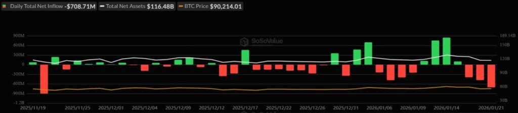 Hari Rabu saja mencatatkan penebusan sebesar $708 jutaāaliran keluar satu hari terbesar sejak November 2025. Aliran keluar ini menunjukkan bahwa investor mungkin masih skeptis terhadap prospek jangka pendek Bitcoin (BTC), meskipun ada beberapa tanda pemulihan harga. Ini juga menandakan bahwa pasar mungkin masih dalam fase penyesuaian, dengan investor menilai ulang posisi mereka dalam menghadapi ketidakpastian pasar.