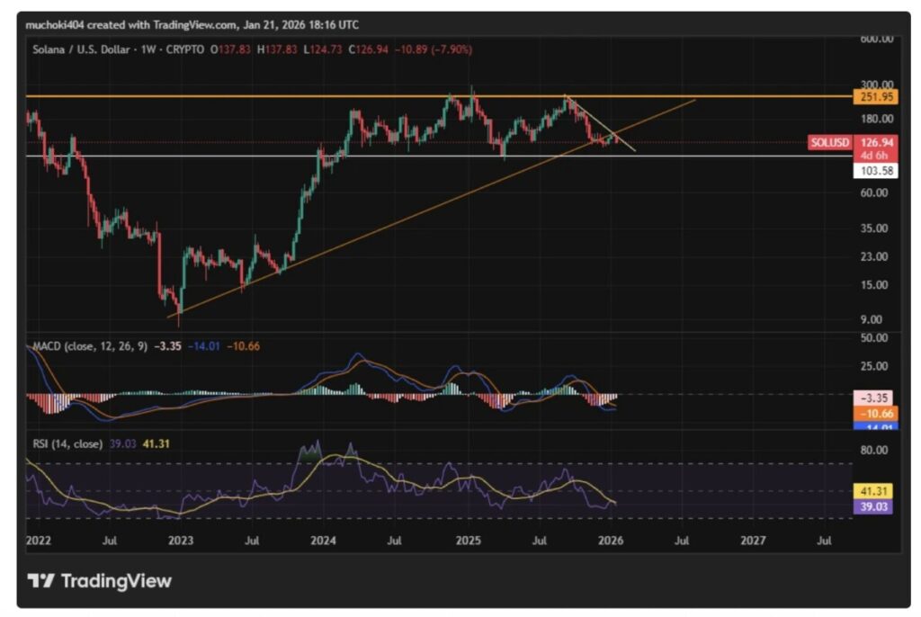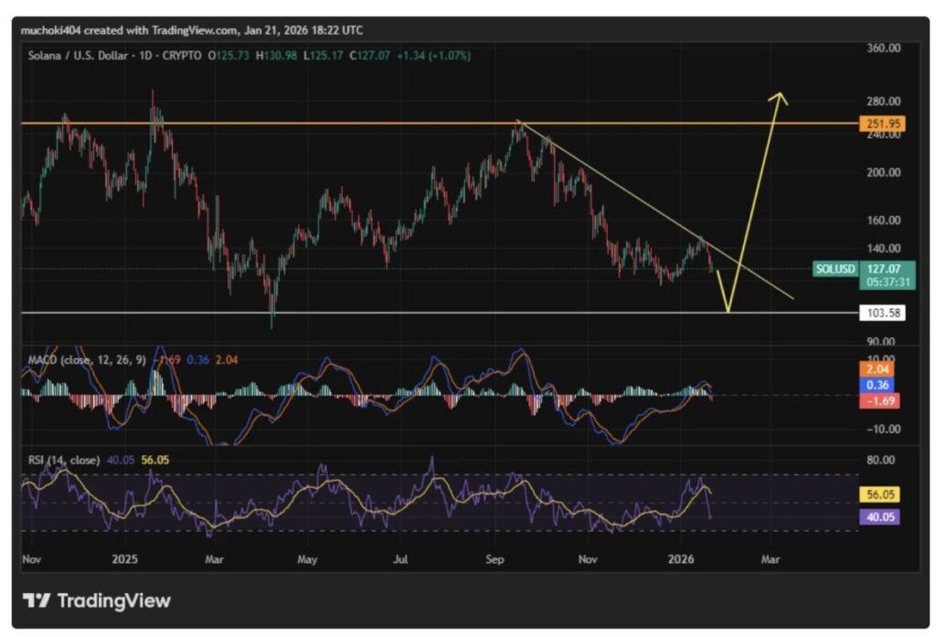 Jakarta, Pintu News ā Harga Solana telah turun lebih dari 12% dalam tujuh hari terakhir dan sempat diperdagangkan di sekitar $127 pada 22 Januari 2026.