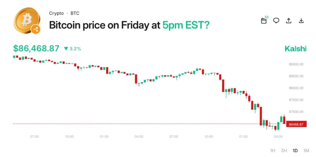 Harga Bitcoin (BTC) diperdagangkan di bawah US$87.000 baru-baru ini, sebuah level teknikal yang penting setelah sebelumnya sempat berkonsolidasi dekat angka tersebut. Penurunan ini mencerminkan tekanan jual dan kehati-hatian investor di tengah pasar yang lebih luas. Pergerakan harga ini mempengaruhi pasar prediksi yang mengukur ekspektasi harga di masa depan.