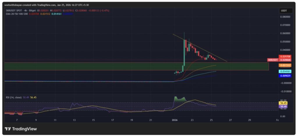 Melambatnya pergerakan rata-rata dan RSI yang berada di kisaran 50 menunjukkan belum ada dominasi jelas antara pembeli dan penjual. Namun, penurunan SKR di bawah garis tren EMA20 mengindikasikan kontrol sementara berada di tangan seller. Jika harga terus bertahan di bawah EMA20, tekanan jual bisa semakin kuat dan mendorong pasangan SKR/USDT turun ke area $0,02.